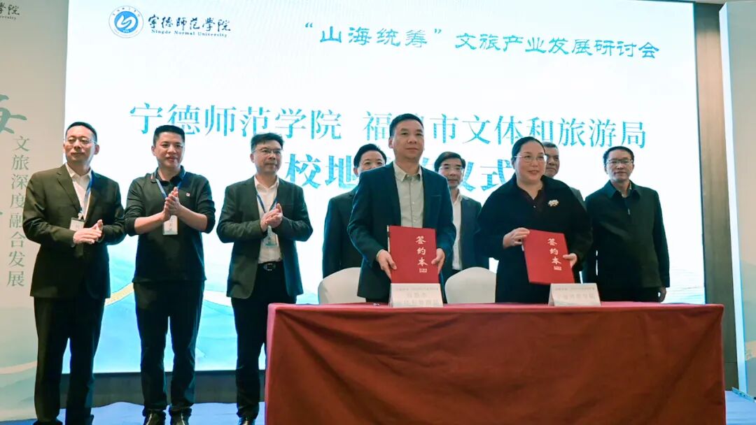 宁德师范学院与霞浦县文体和旅游局、福鼎市文体和旅游局举行签约仪式;宁德师范学院授予霞浦县旅游协会、福安市旅游协会、罗源湾海洋世界、宁德福之旅旅行社、福州三迪希尔顿酒店、福州泰禾铂尔曼酒店等6家单位“文旅人才培养”教学实践基地牌匾。